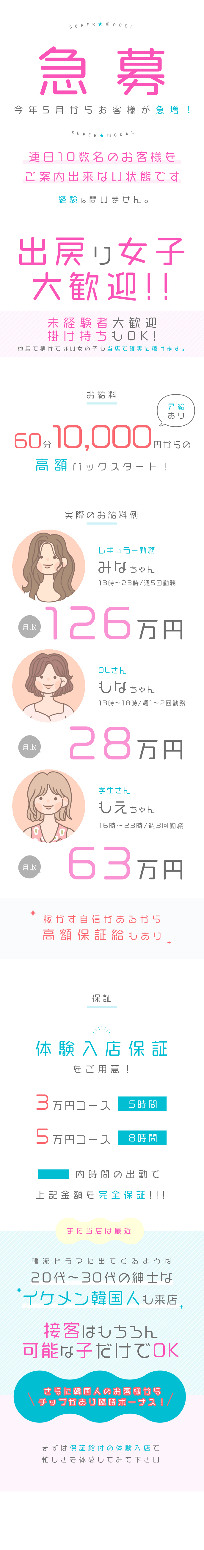 - 18歳以上(高校生不可) 経験者・未経験者、共に大歓迎です! 掛け持ち・タトゥー・妊娠線OK☆ その他ご相談ください。